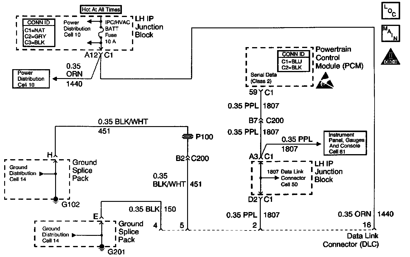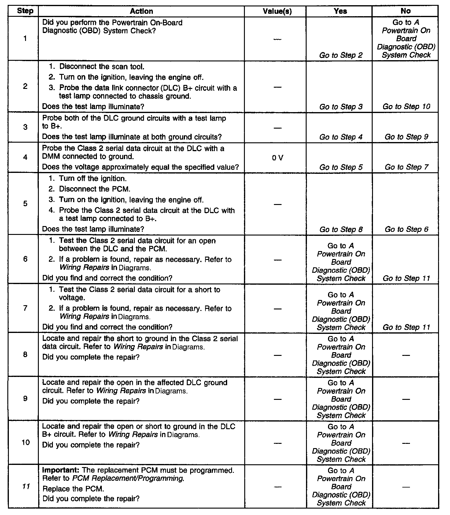 The Class 2 serial data circuit to the Data Link Connector (DLC) allows bi-directional communication between the Powertrain Control Module (PCM)and a scan tool. If communication between the scan tool and the PCM cannot be established, the procedure in the DLC Diagnosis table should be used to diagnose the condition.