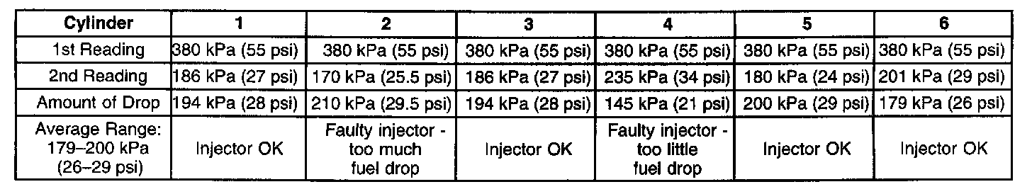 6. If the pressure drop value for each fuel injector is within 10 kPa (1.5 psi) of the average pressure drop value, the fuel injectors are flowing properly. Calculate the pressure drop value for each fuel injector by subtracting the second pressure reading from the first pressure reading. Refer to the Injector Balance Test Example. Component Tests and General Diagnostics