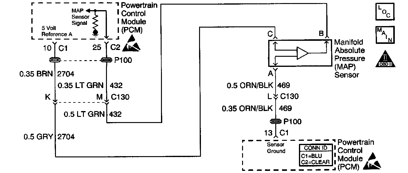 The Manifold Absolute Pressure (MAP) sensor responds to changes in intake manifold pressure. The MAP sensor signal voltage to the Powertrain Control Module (PCM) varies from below 2 volts at idle, high vacuum, to above 4 volts with the key ON, engine OFF or at Wide-Open Throttle (WOT), low vacuum. The MAP sensor is used to determine manifold pressure changes while the EGR flow test diagnostic is being run, refer to DTC P0401 Exhaust Gas Recirculation (EGR) Flow Insufficient, also to update the Barometric Pressure Reading (BARO), and as a enabling factor for other diagnostics. The PCM monitors the MAP signals for voltages outside the normal range of the MAP sensor. If the PCM detects a MAP signal voltage that is excessively high, refer to DTC P0108 Manifold Absolute Pressure (MAP) Sensor Circuit High Voltage. If the PCM detects a MAP signal voltage that is excessively low, refer to DTC P0107 Manifold Absolute Pressure (MAP) Sensor Circuit Low Voltage. P0401 P0108 P0107