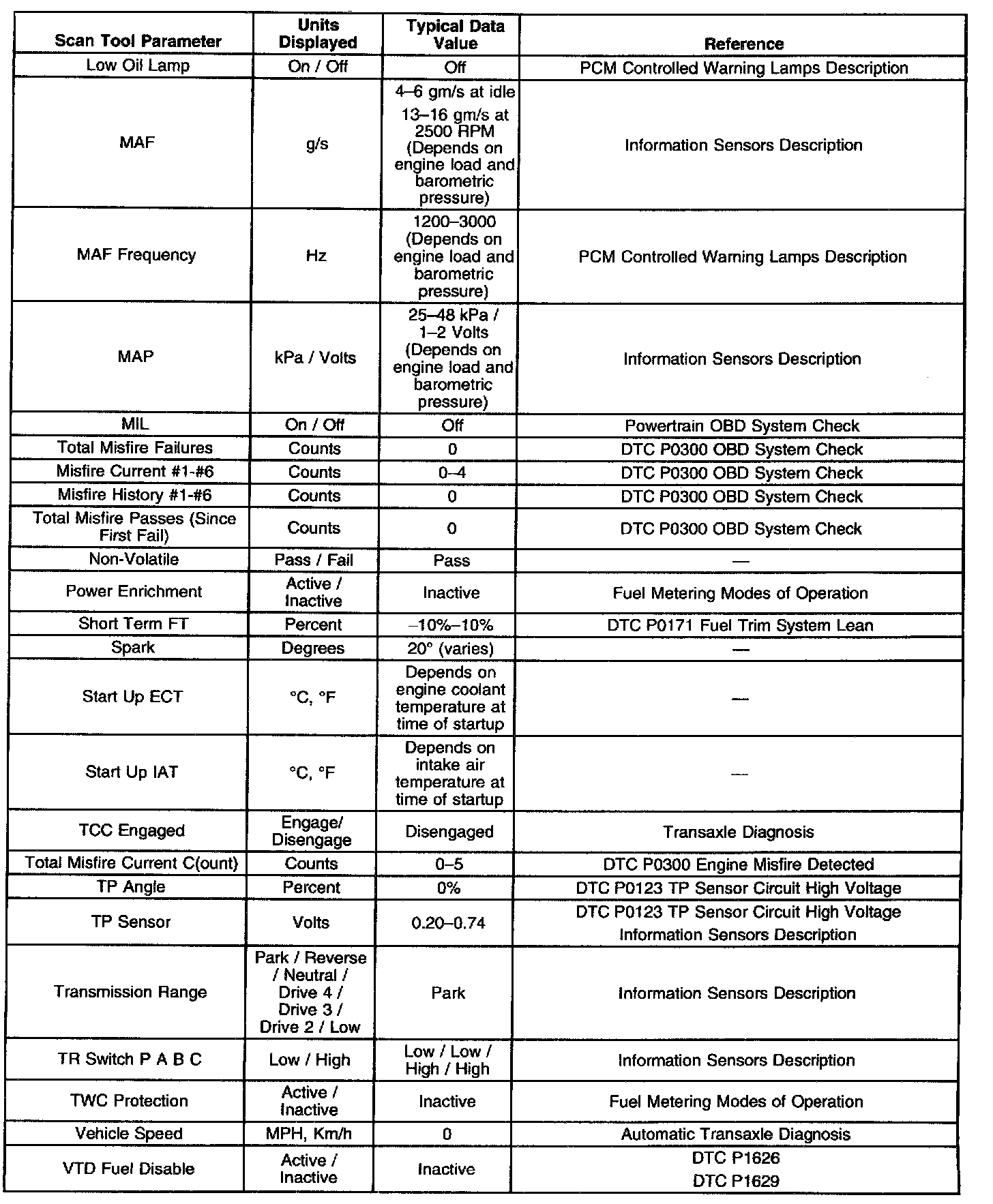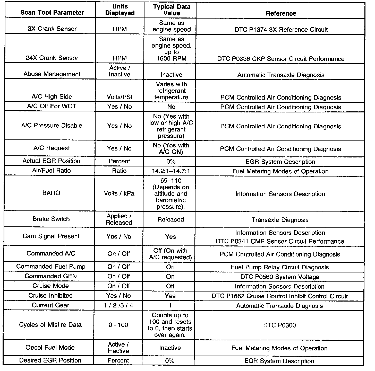The column labeled Data List indicates where a parameter can be located on the scan tool. Refer to the scan tool operating manual for the exact locations of the data lists. The following is a description of each term listed: