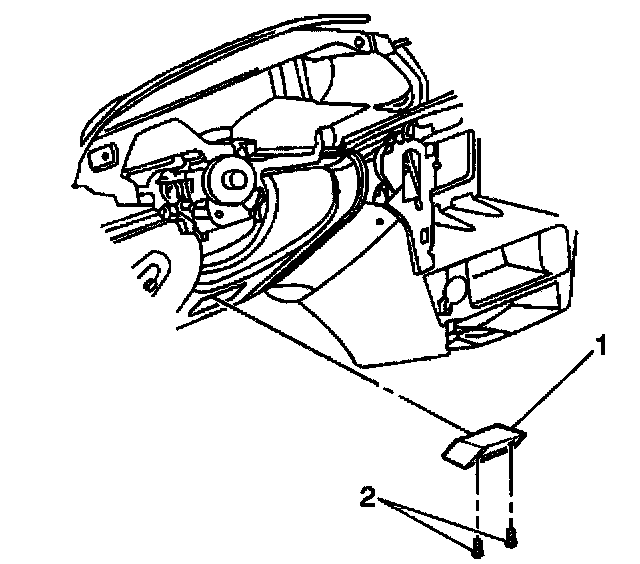 7. Remove the 2 screws (2) and the lap air duct (1) from the instrument panel.
