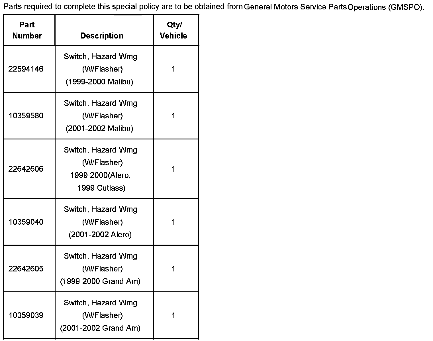 Some customers of 1999-2002 Chevrolet Malibu, Oldsmobile Alero, Pontiac Grand Am, and 1999 Oldsmobile Cutlass may have turn signal/hazard flashers that become inoperative.