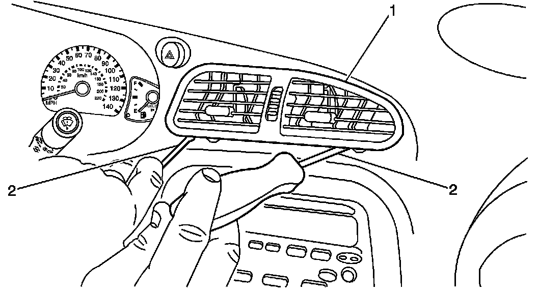 2. Using two flat-blade screwdrivers (2), carefully release the two retainers that attach the IP center air outlet (1). With both retainers released, pull the bottom of the outlet rearward to release the top.
