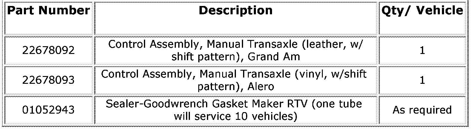 Involved are certain 2000-01 Oldsmobile Alero and Pontiac Grand Am model vehicles equipped with manual transaxle (RPO M86) and built within the VIN breakpoints shown.
