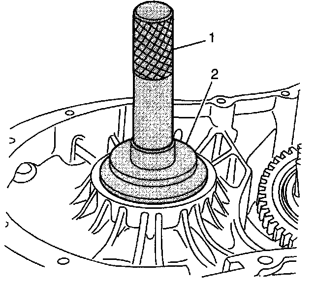 9. Make sure the left differential bearing race is fully seated into the transaxle case using the J 7079-2 (1) and the J 44385 (2).