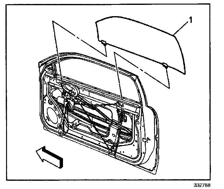 6. Install the bolts which secure the window (1) to the regulator.