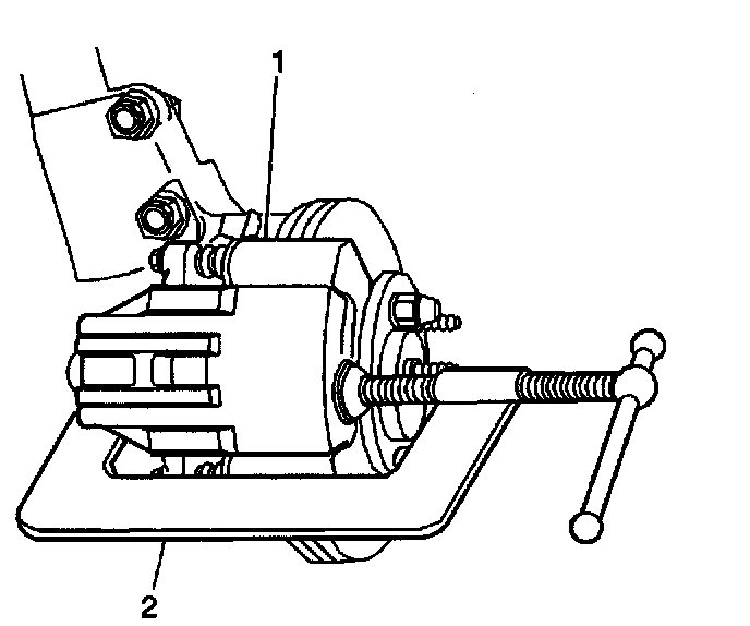5.1. Install a large C-clamp (2) over the top of the caliper housing (1) and against the back of the outboard pad.
