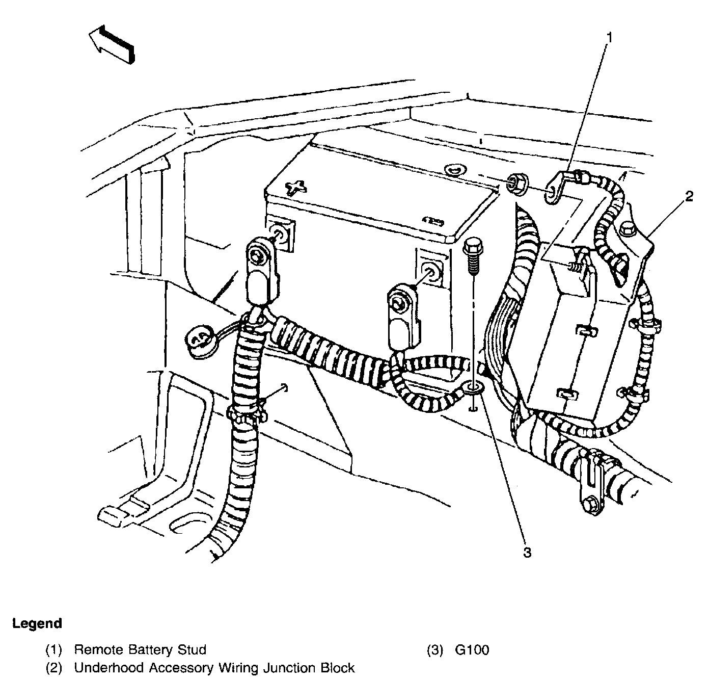 Engine compartment, pant of the underhood engine wiring junction block, front of the strut tower