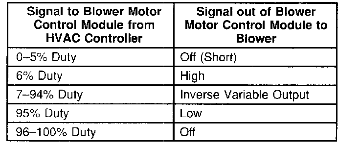 The blower motor controller module contains solid state circuitry. At a given duty cycle, the circuitry utilizes a pulse width voltage signal from the control head. The circuitry returns an inverse pulse width signal to the blower motor.[1][2]Blower Control Module Signals