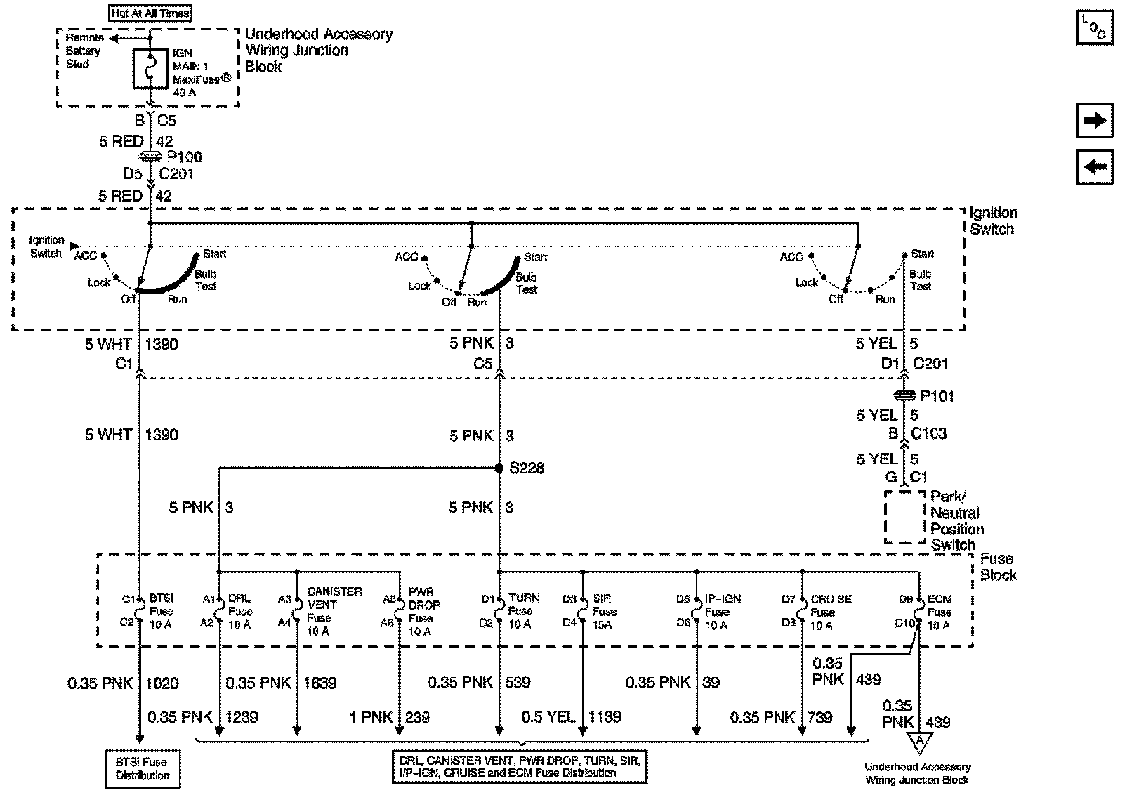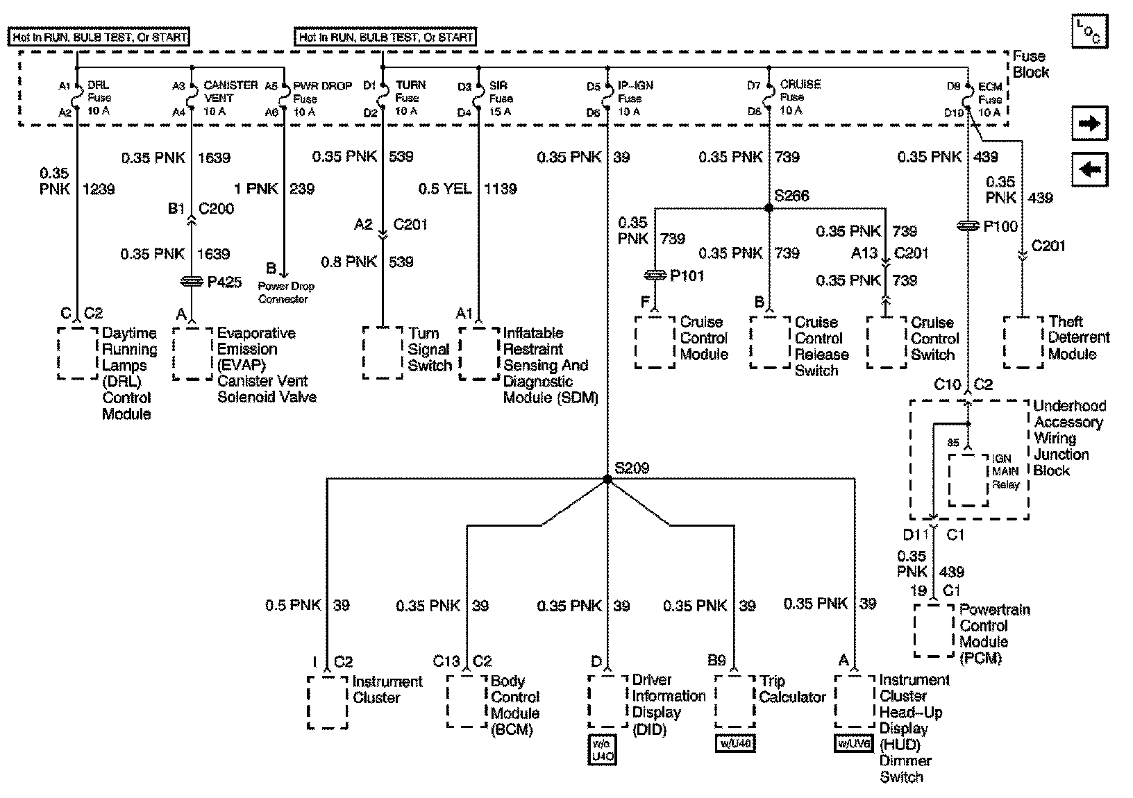 DRL, Canister, PWR DROP, TURN, SIR, IP-IGN, CRUISE, and ECM Fuse