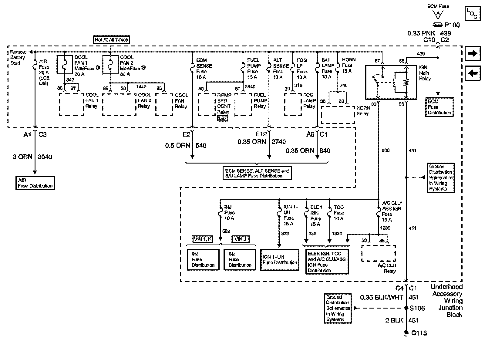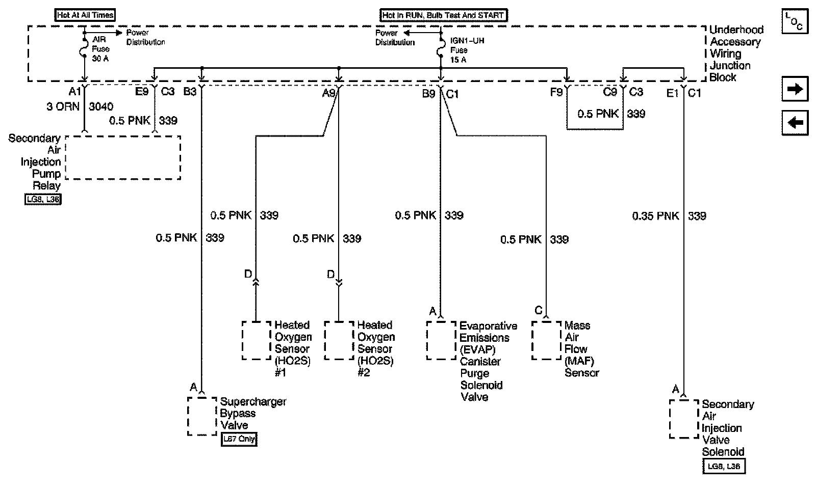 Underhood Accessory Wiring Junction Block, Secondary Air Injection PUmp Relay, Secondary Air Injection Valve Solenoid, Supercharger Bypass Valve, Heated Oxygen Sensors, MAF and EVAP