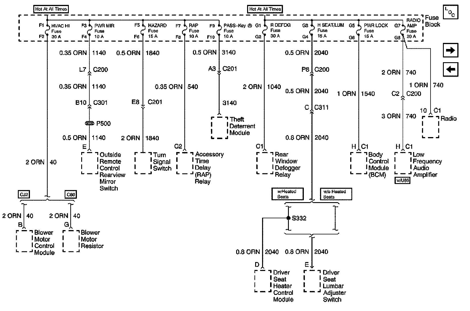 HVAC HI, PWR MIR, HAZARD, RAP, PASSKEY, R DEFOG, H SEAT/LUM, PWR LOCK and RADIO AMP Fuse