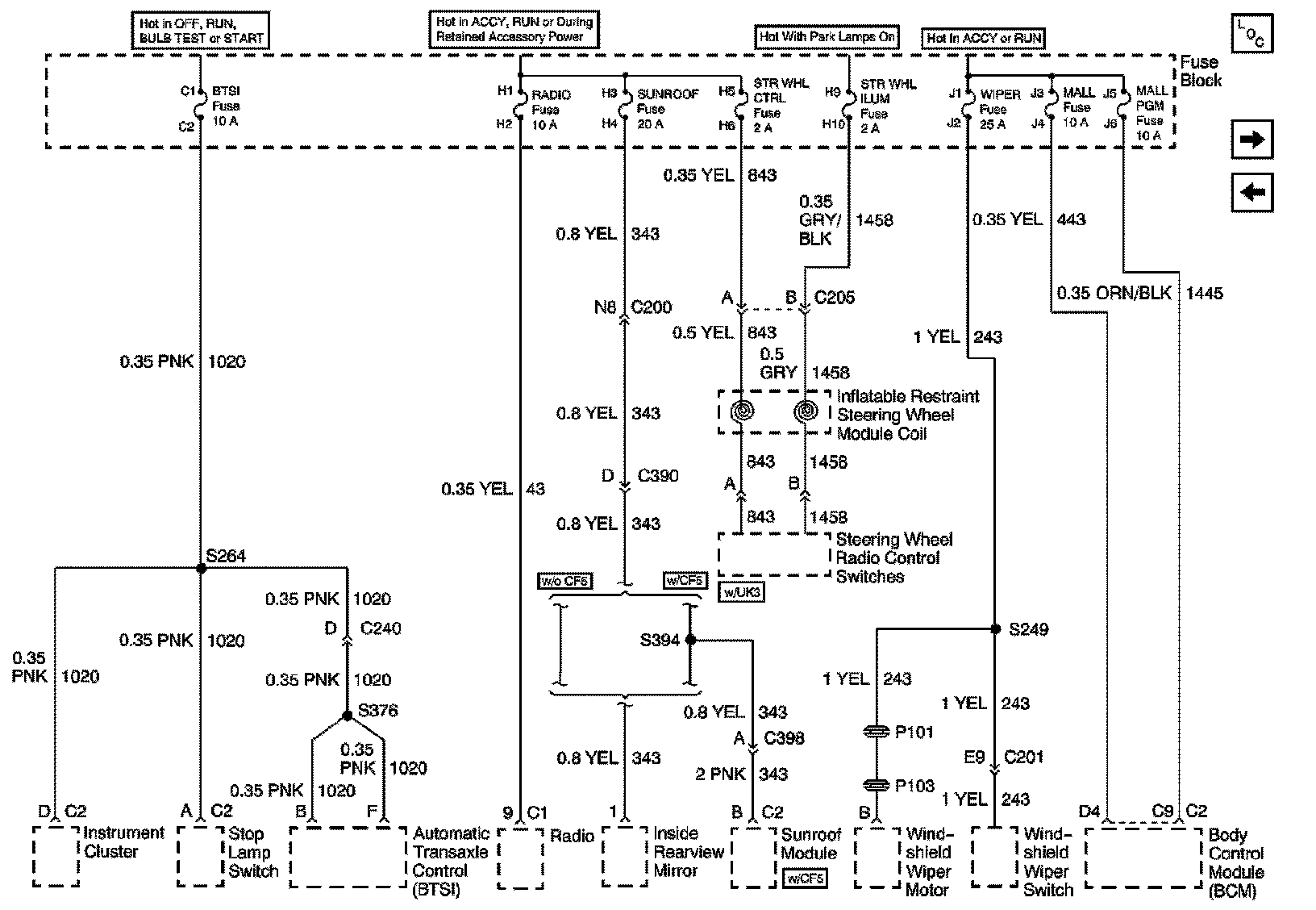 BTSI, RADIO, SUNROOF, STR WHL CTRL, STR WHL ILLUM, WIPER, MALL and MALL PGM Fuse