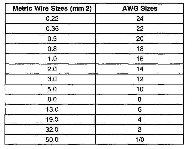 Wire Size Conversion Table: