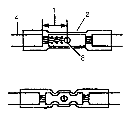 9. Insert the wires into the splice sleeve until the wire hits the barrel stop. The splice sleeve has a stop in the middle of the barrel in order to prevent the wire from passing through the splice (3).
