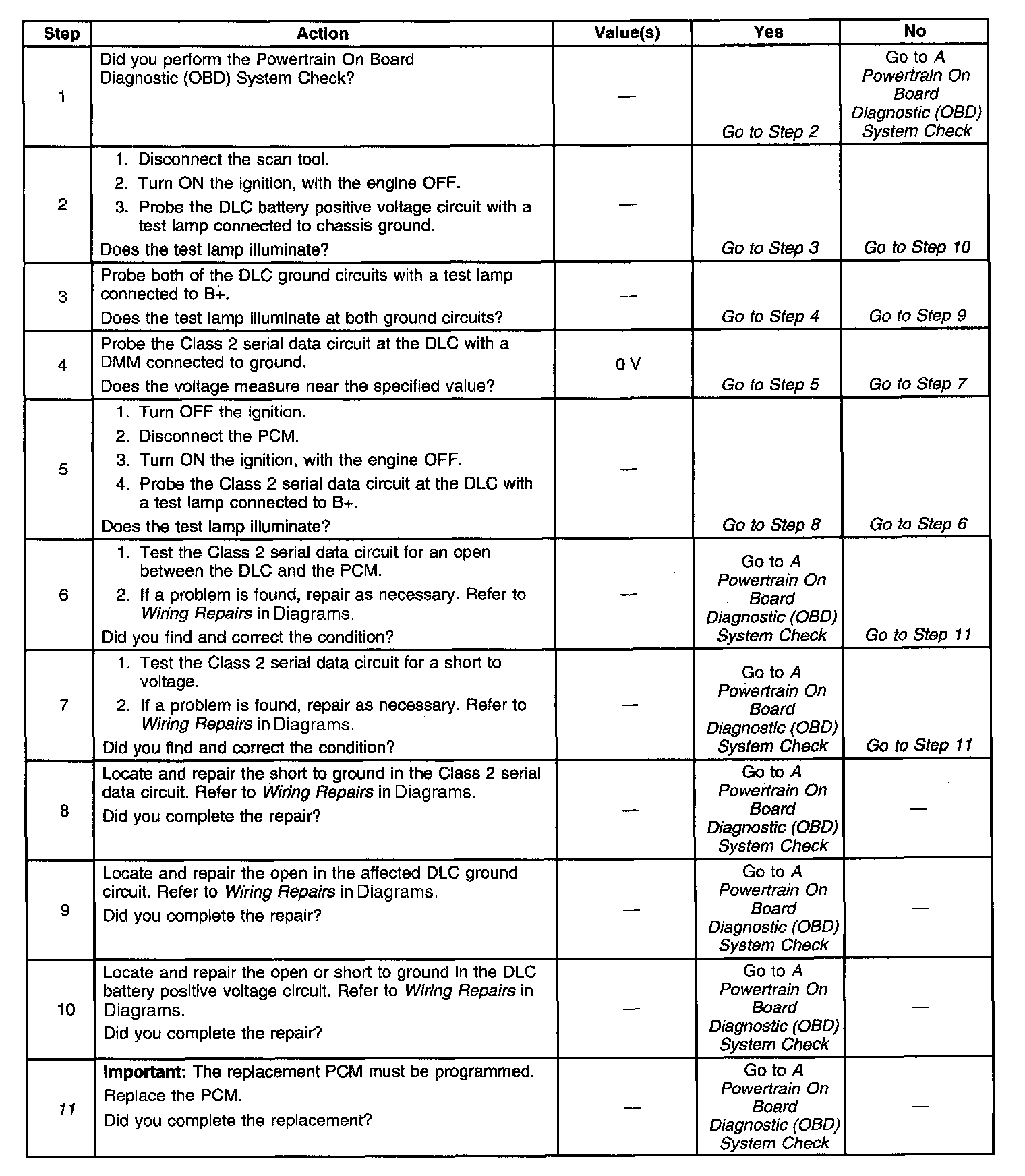 The Class 2 serial data circuit to the DLC allows bi-directional communication between the PCM and a scan tool. If communication between the scan tool and the PCM cannot be established, the procedure in the DLC Diagnosis table should be used to diagnose the condition.