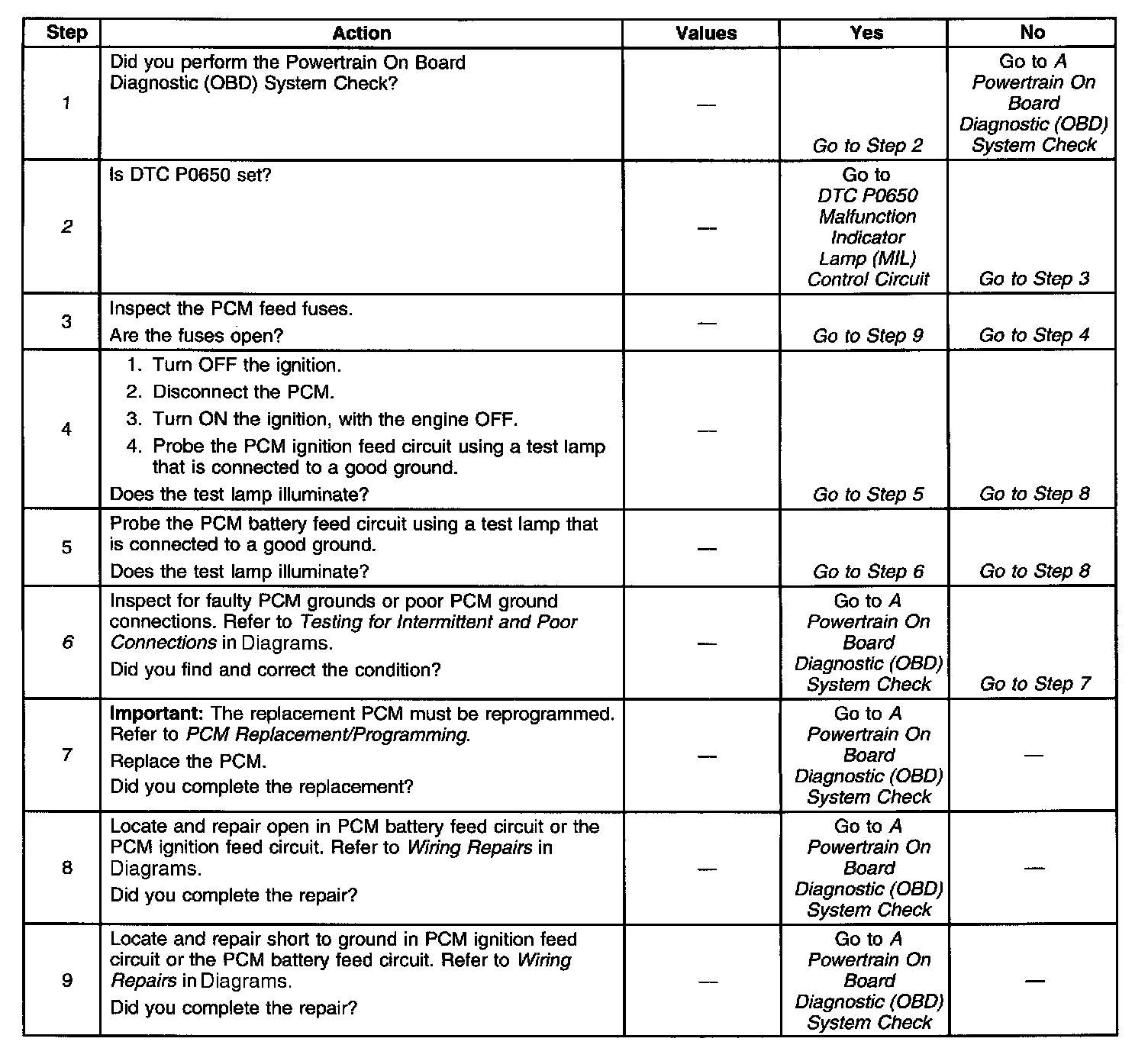 ^ If the engine cranks but will not run, test for an open PCM ignition or battery feed or a poor PCM to engine ground.