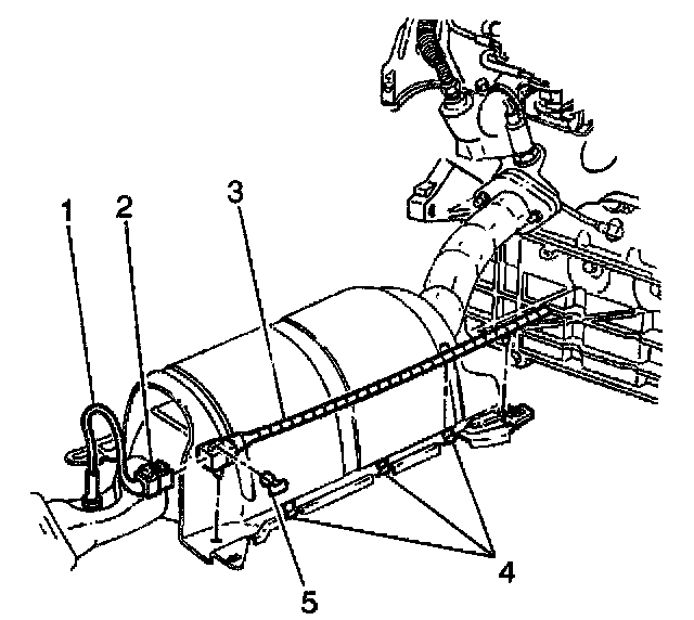 4. Remove the oxygen sensor wiring harness (3) from the catalytic converter heat shield.