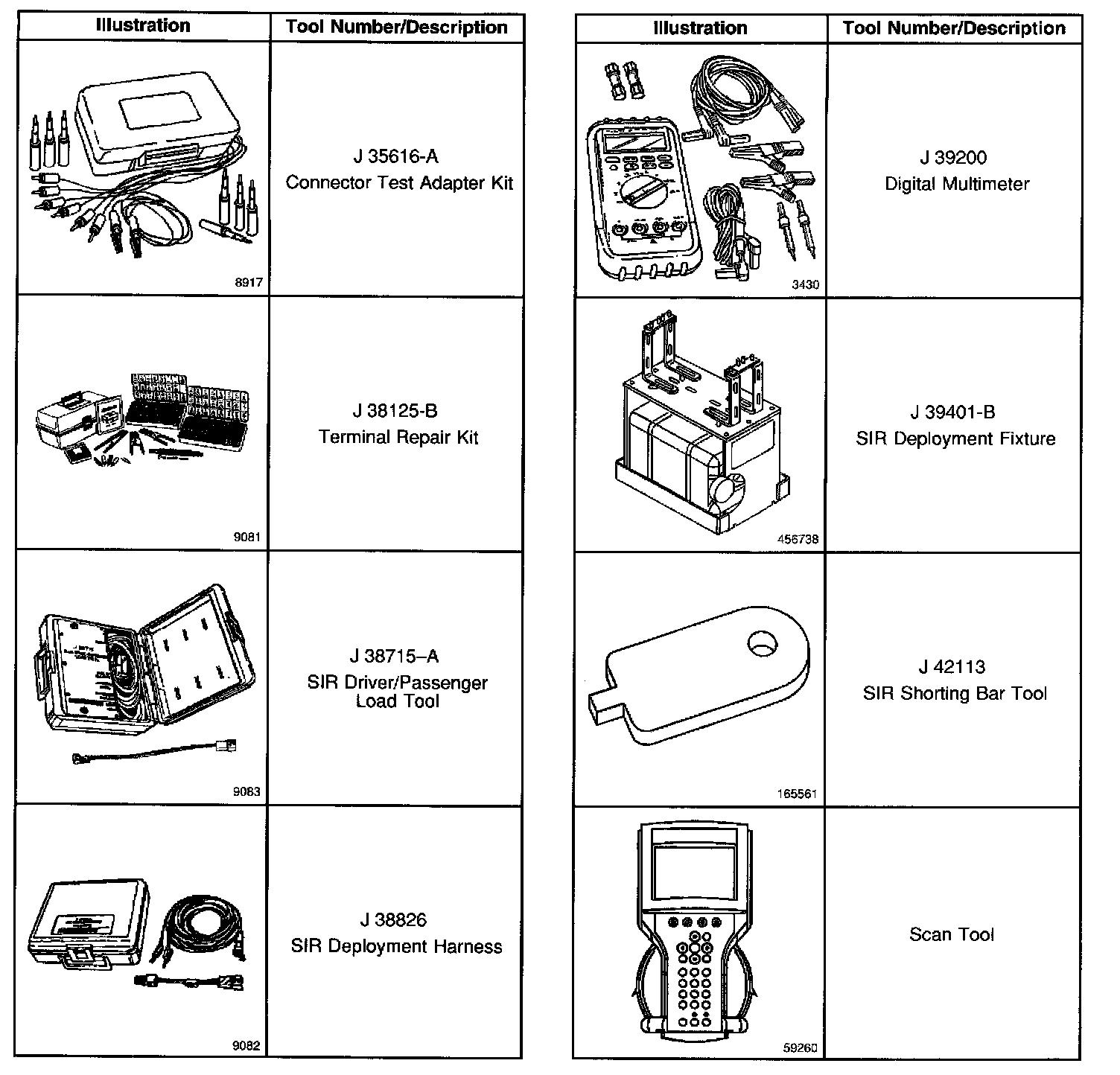 Use the J 38125-B Terminal Repair kit for SIR wiring repair. This kit contains a special crimping tool, heat torch, and sealed splices. Do not use the terminals in the kit in order to replace damaged SIR system terminals unless specifically indicated by the terminal package.