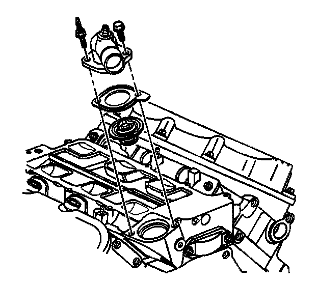 2. If removed, install the thermostat, the gasket, and the water outlet housing. Refer to Thermostat Replacement in Cooling System.