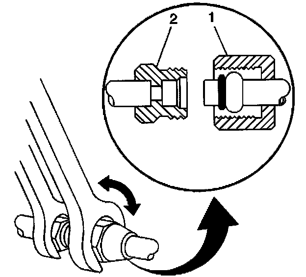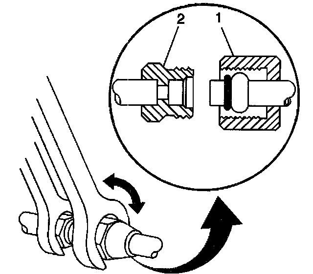 8. For compression-style fittings; use a back-up wrench on the A/C refrigerant component (smaller size) fitting (2), then tighten the A/C refrigerant hose (larger size) fitting (1) to specification.