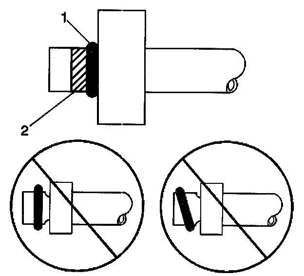 6. Lightly lubricate the new O-ring seal (1) with mineral base 525 viscosity refrigerant oil. Leave a light coating of the refrigerant oil to remain on the A/C refrigerant hose in the area indicated (2) ONLY.