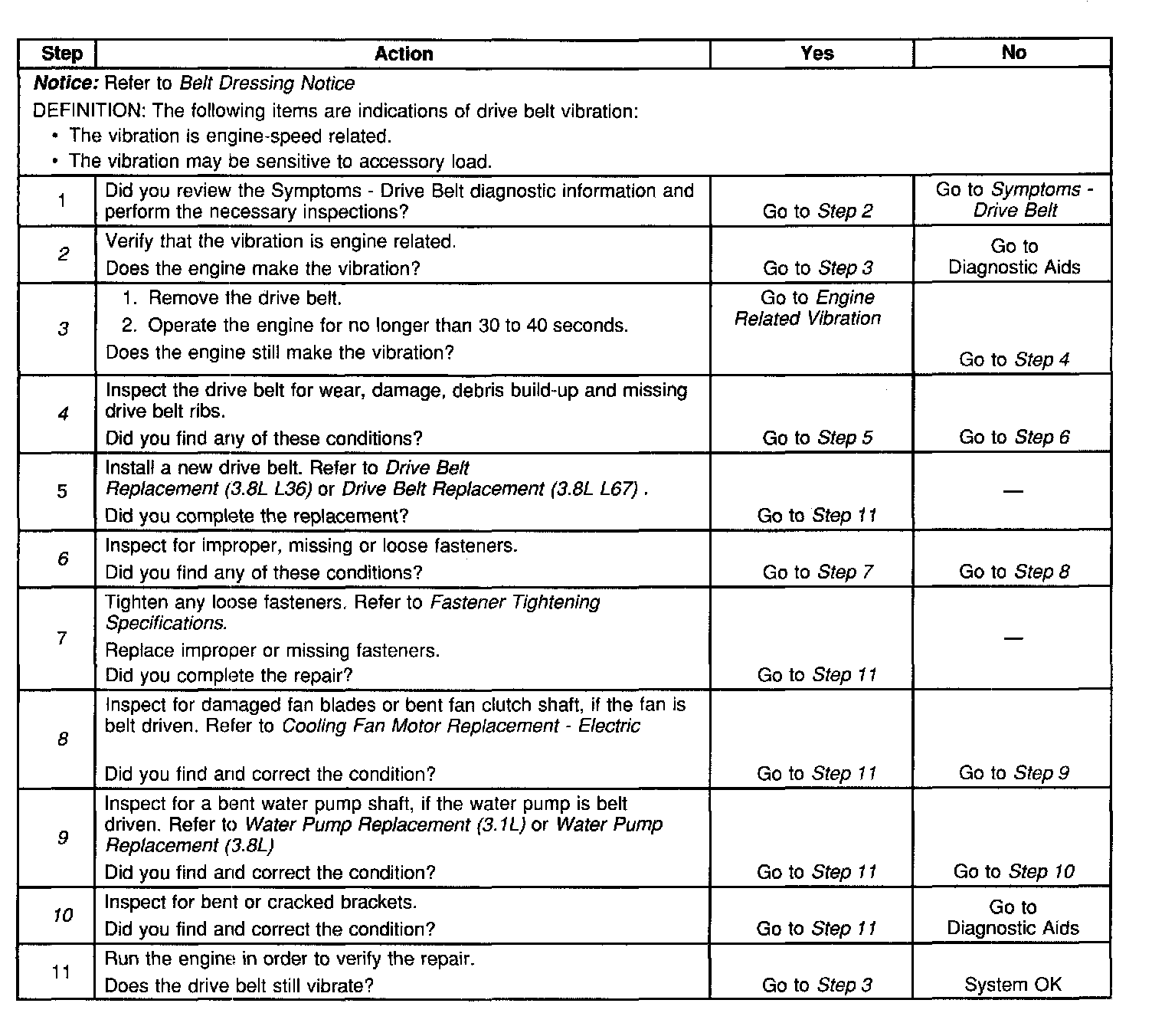 3. This test is to verify that the drive belt or accessory drive components may be causing the vibration. With the drive belt removed the water pump may not operate and the engine may overheat. Also DTCs may set when the engine is operated with the drive belt removed.