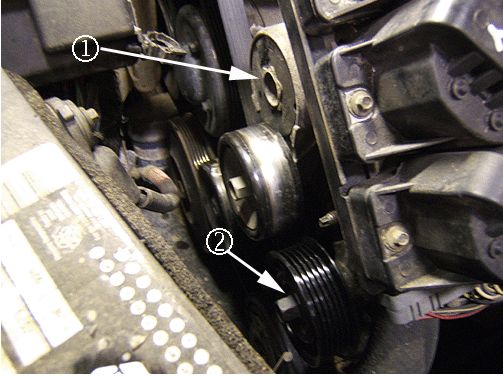7. Remove the supercharger drive belt tensioner (1) and idler pulley (2).
