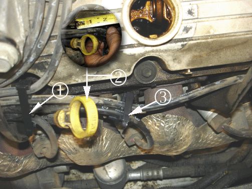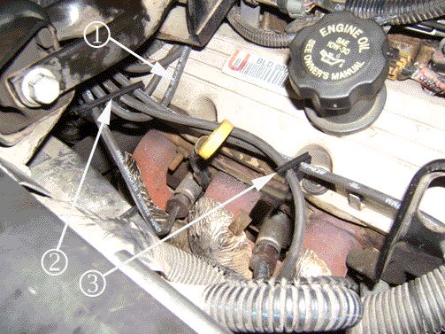 3. Install the 7 mm two-wire spark plug retainer, P/N 12132229 (Qty 10) to spark plug wires 3 and 5 only (3). Make sure the spark plug retainer (3) is approximately 50 mm (2 in) from the oil level indicator.