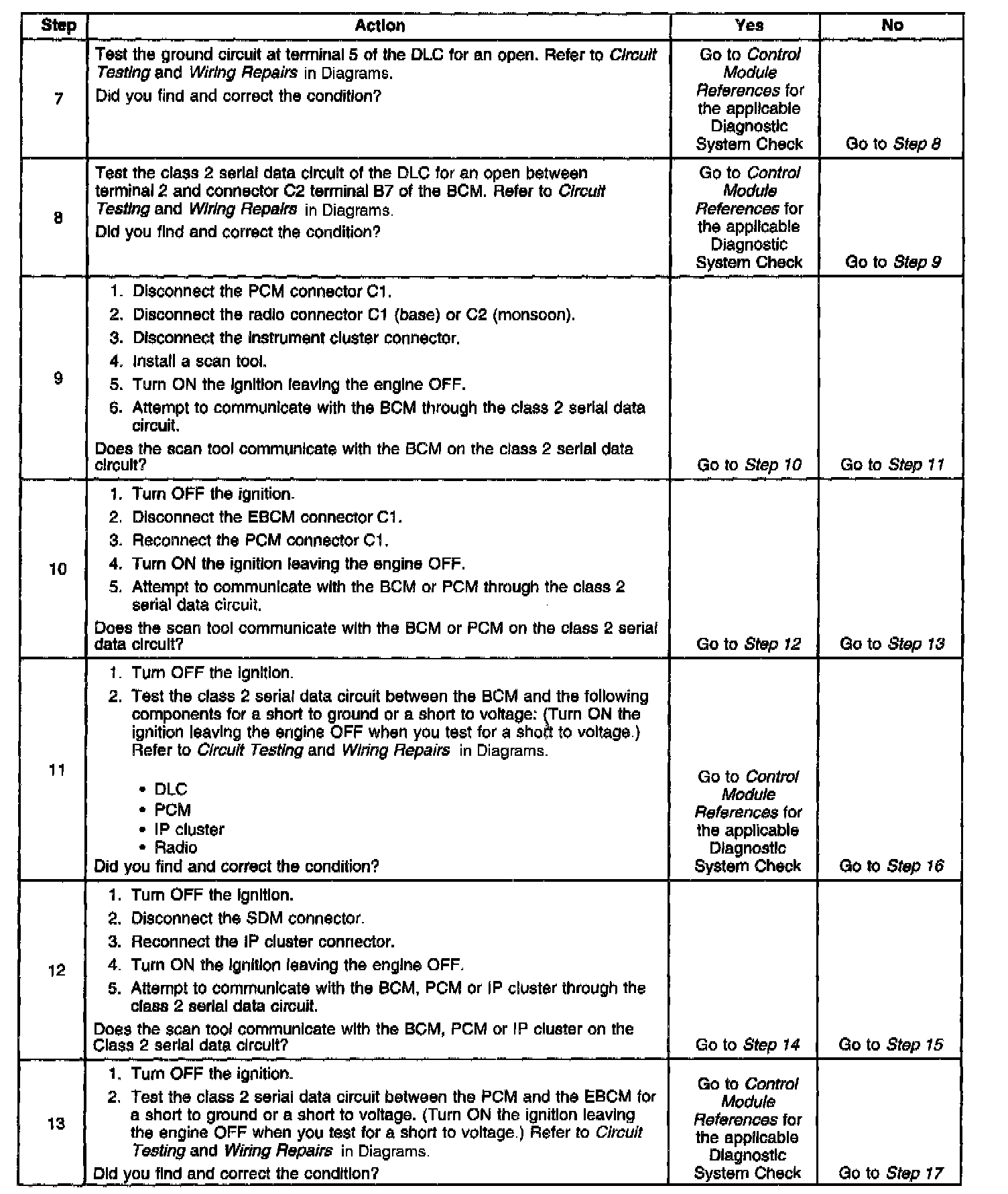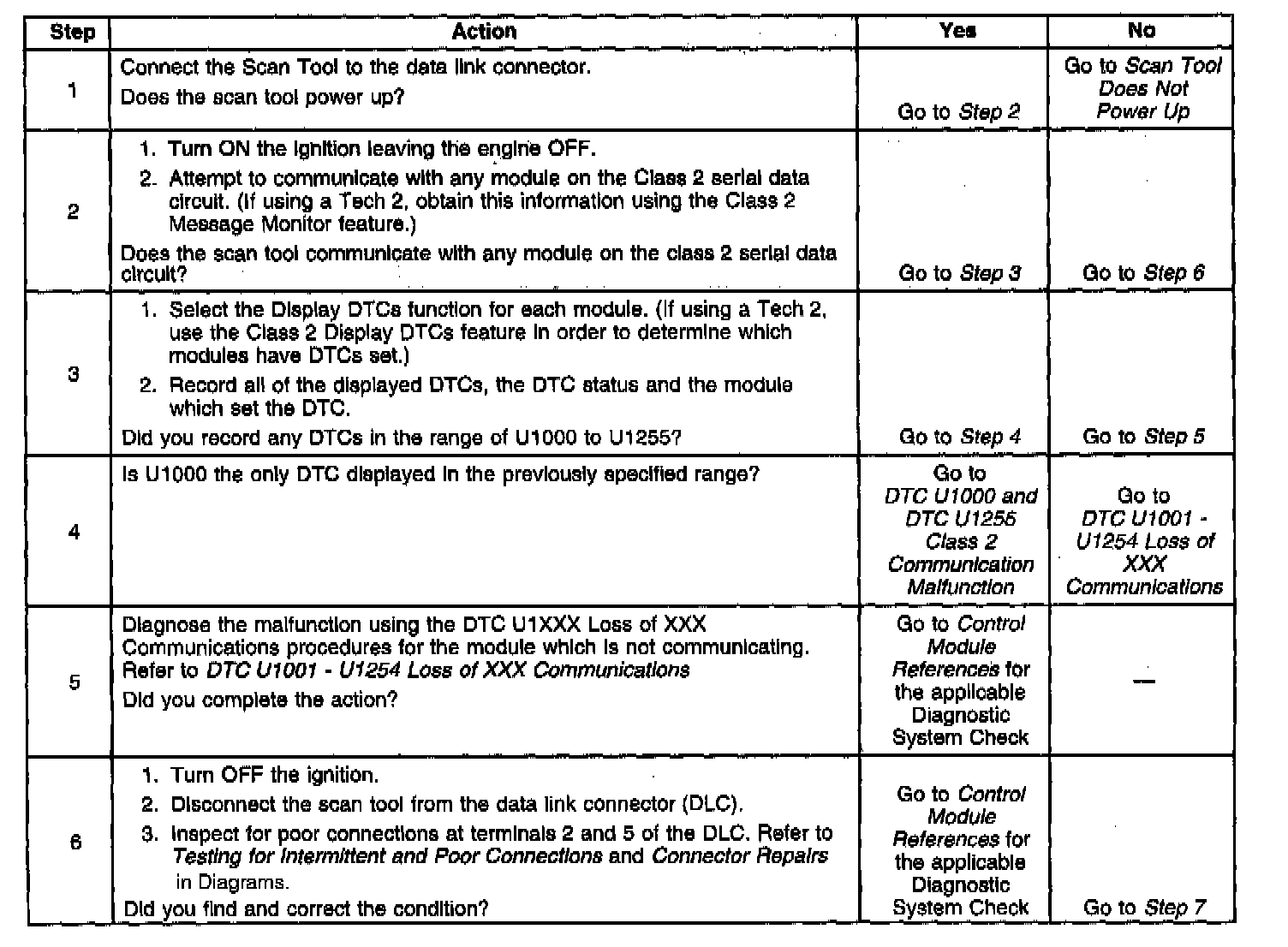 8. An open in the class 2 serial data circuit between the DLC and the body control module (BCM) will prevent the scan tool from communicating with any module. This condition will not set a DTC.