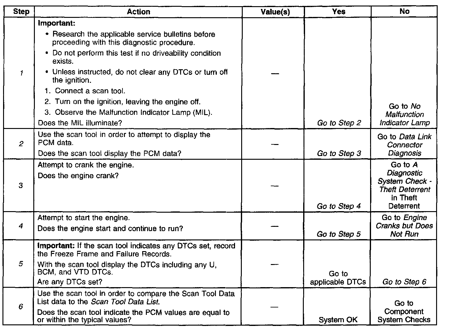 The Powertrain On-Board Diagnostic (OBD) System Check must be the starting point for any driveability complaint diagnosis. Before using this procedure, you should perform a careful visual/physical inspection of the PCM and engine grounds for being clean and tight. The Powertrain On-Board Diagnostic (OBD) System Check is an organized approach to identifying a problem created by an electronic engine control system malfunction