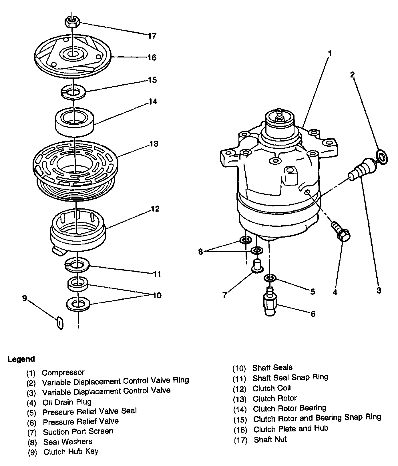 This A/C system uses the constant run V-5 compressor. The V-5 is a variable displacement compressor that can match the automotive A/C demand under all conditions without cycling. The basic compressor mechanism is a variable angle wobble-plate with 5 axially oriented cylinders. The center of control of the compressor displacement is a bellows actuated valve located in the rear head of the compressor that senses suction pressure. The difference in crankcase suction pressure controls the wobble-plate angle and the compressor displacement.