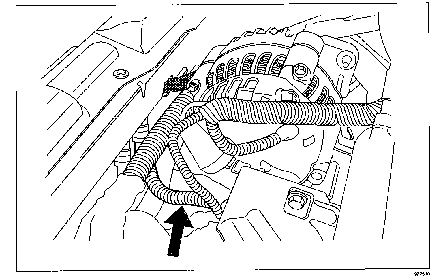 6. Route the A/C pressure sensor wiring harness so that there is enough slack in the harness that normal engine movement will not pull the A/C pressure sensor connector loose. Tie strap the pressure sensor wiring harness to the A/C compressor inlet hose. Make sure that the harness is routed away from any moving parts or sharp edges.