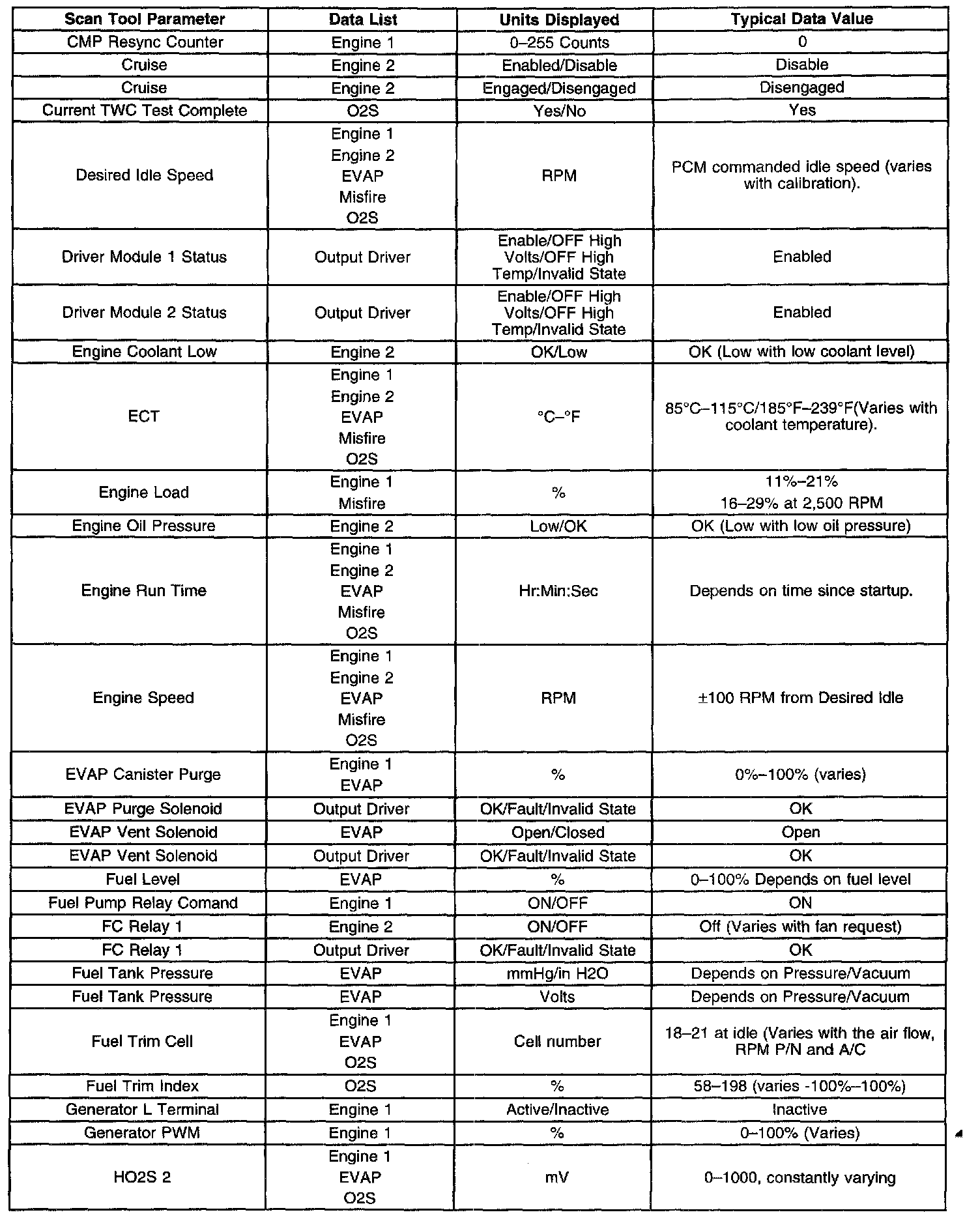 Use the Typical Scan Data Values table only after the Powertrain On Board Diagnostic (OBD) System Check has been completed, no DTCs were noted and you have determined the on-board diagnostics are functioning properly. Scan tool values from a properly running engine may be used for comparison with the engine you are diagnosing. The Typical Scan Data values represent values that would be seen on a normally running engine.