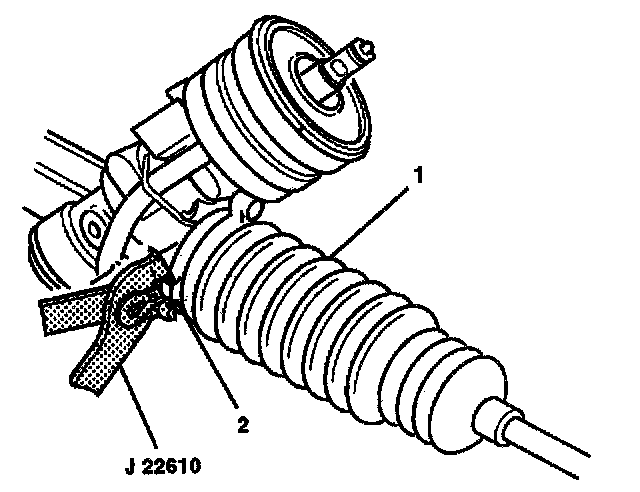 7. Install the boot clamp (2) onto the rack and pinion boot (1) with J 22610.