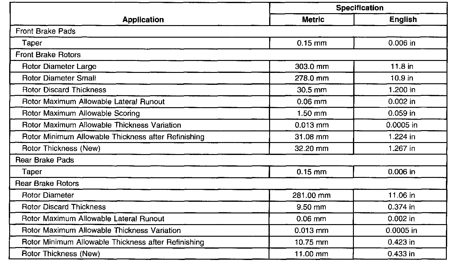 Disc Brake Component Specifications