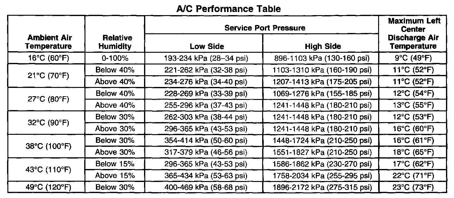 A/C Performance Table: