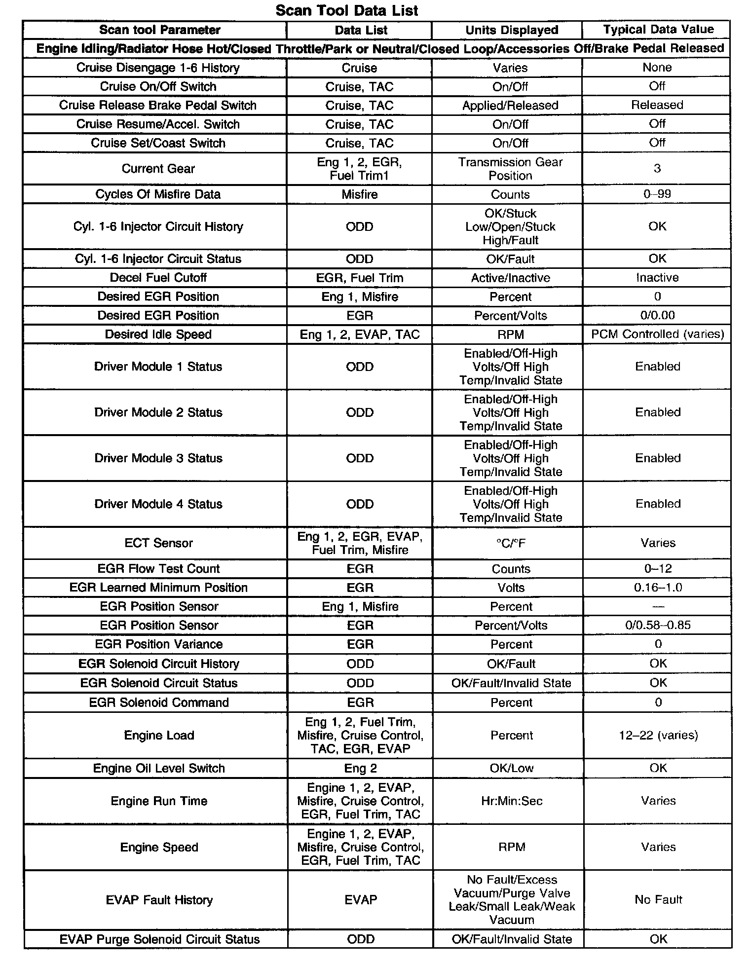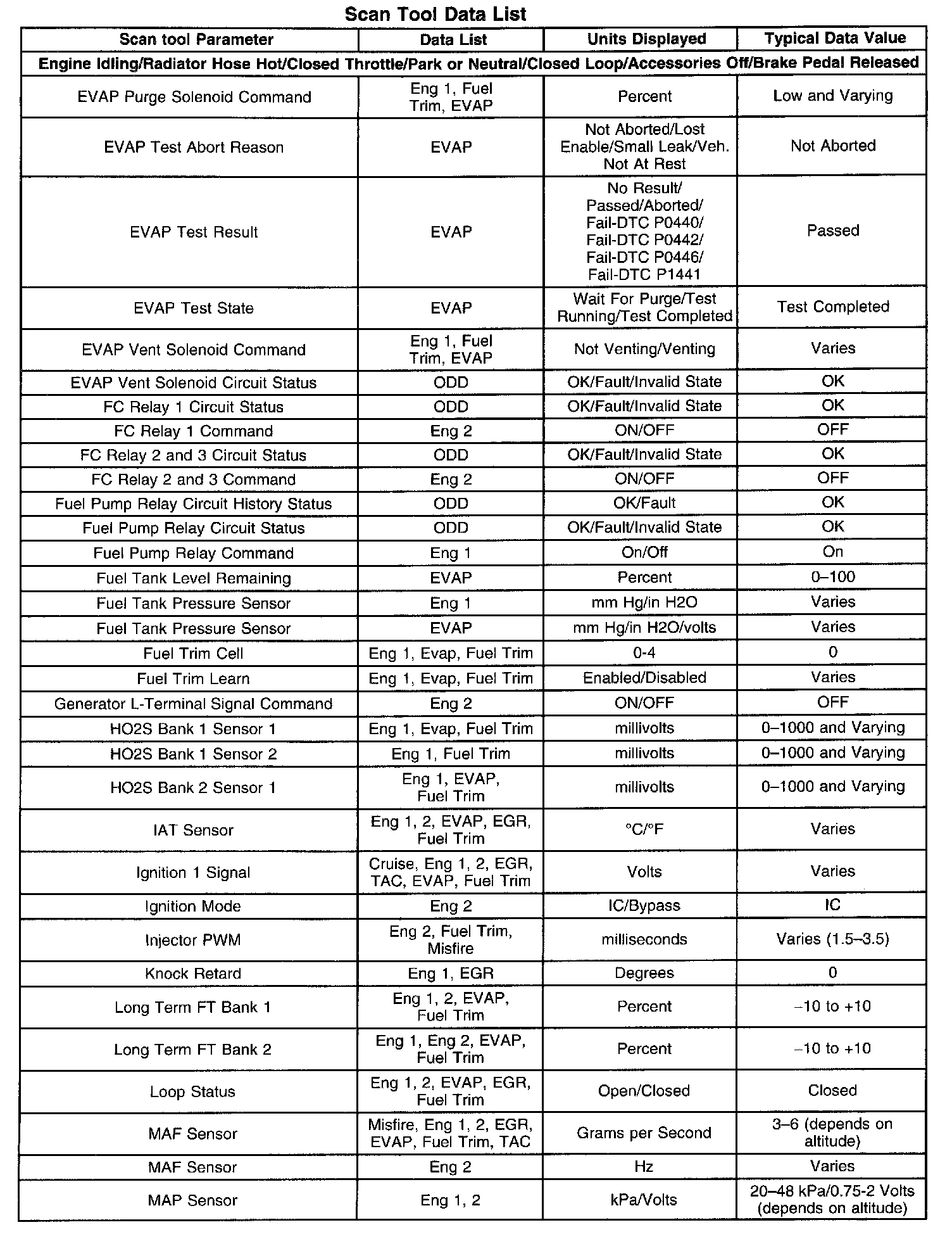 Scan tool values from a properly running engine may be used for comparison with the engine you are diagnosing. The Engine Scan Tool Data List represents values that would be seen on a normally running engine.