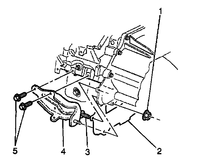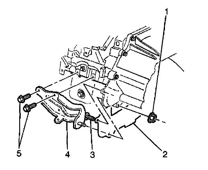 3. Remove the transmission brace bolts (5) attaching the left brace (4) to the engine block.