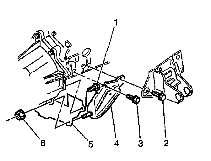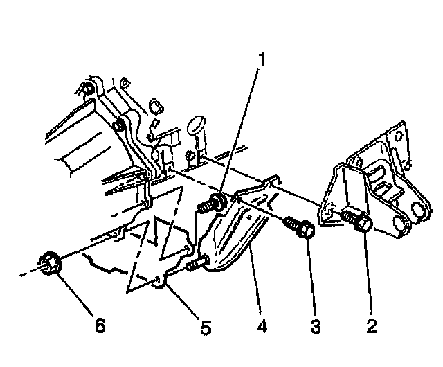 9. Remove the transmission brace nut (6) attaching the right brace (4) to the transmission.