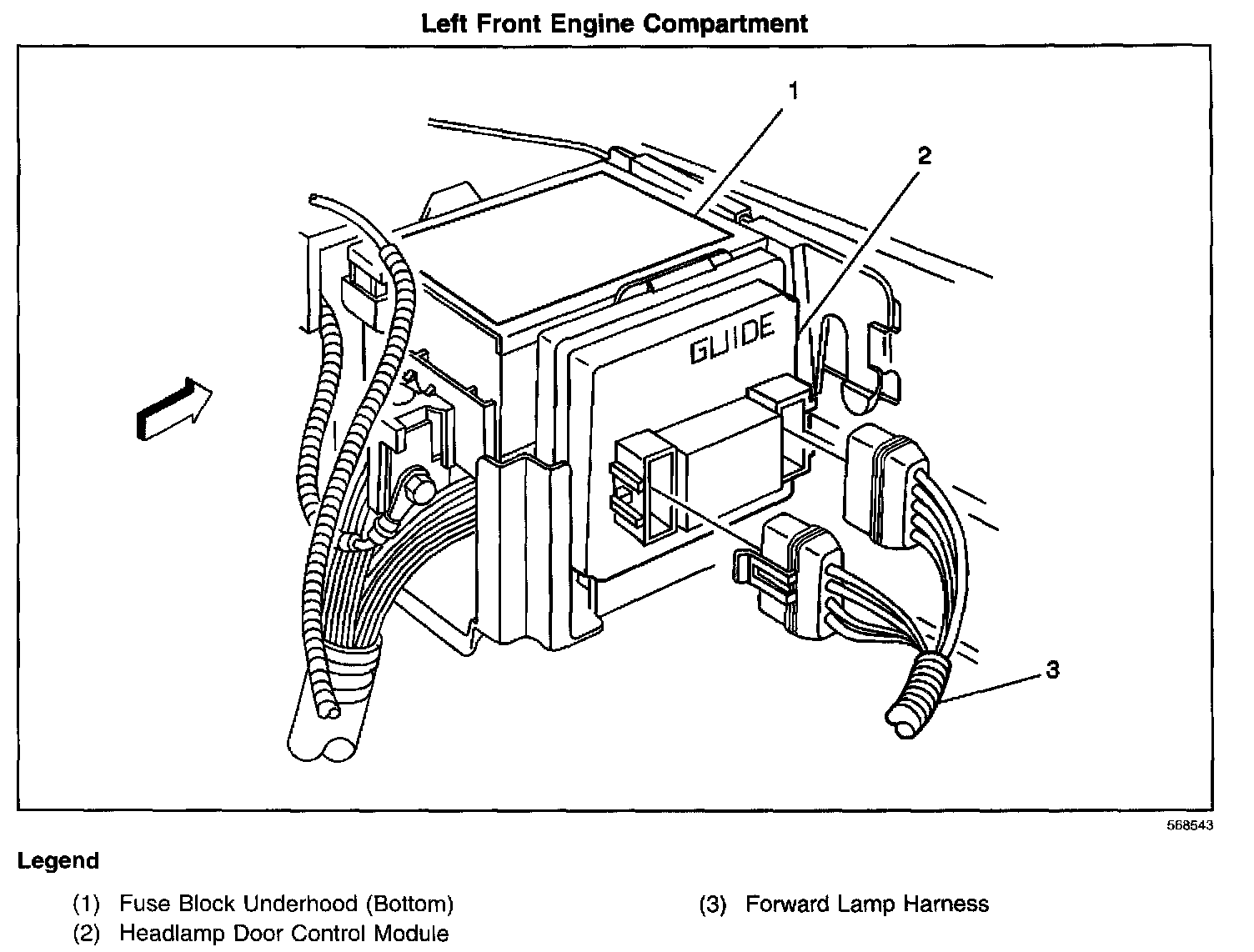 On the front right side of the engine compartment, beside the underhood electrical center 2