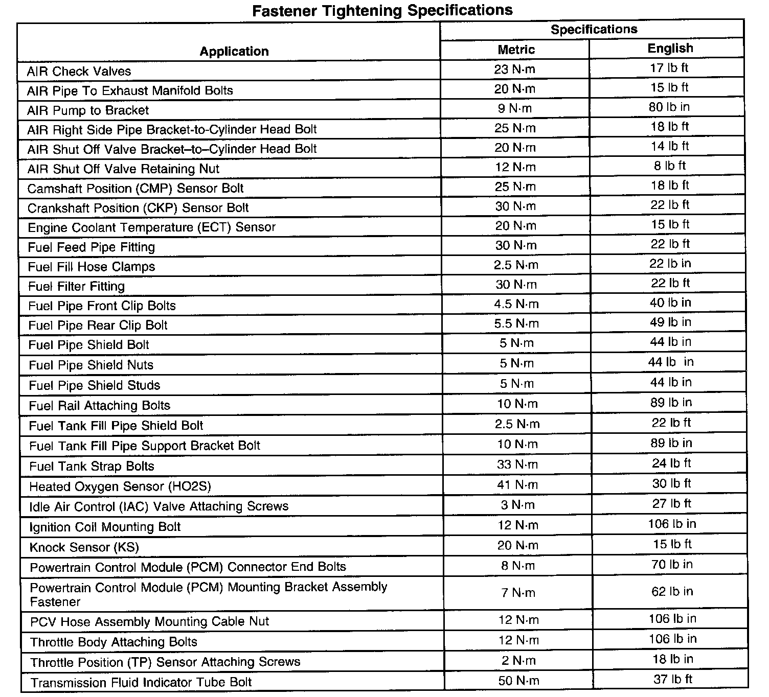 Fastener Tightening Specifications: