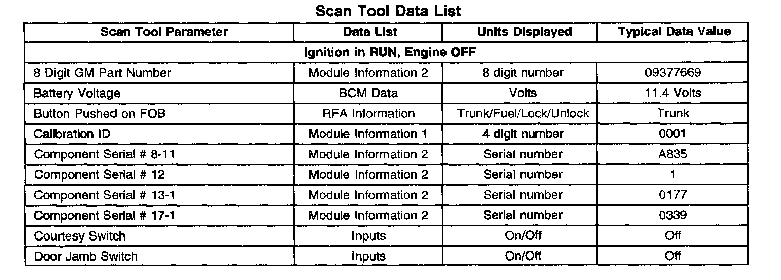 The Keyless Entry Scan Tool Data List contains all of the keyless entry related parameters that are available on the scan tool. The parameters in the list are arranged in alphabetical order. The column, Data List, indicates the location of the parameter within the scan tool menu selections. Use the Keyless Entry Scan Tool Data List as directed by a diagnostic table or in order to supplement the diagnostic procedures. Begin all of the diagnostic procedures with Diagnostic System Check - Remote Keyless Entry. Use the Scan Tool Data List only after the following is determined: