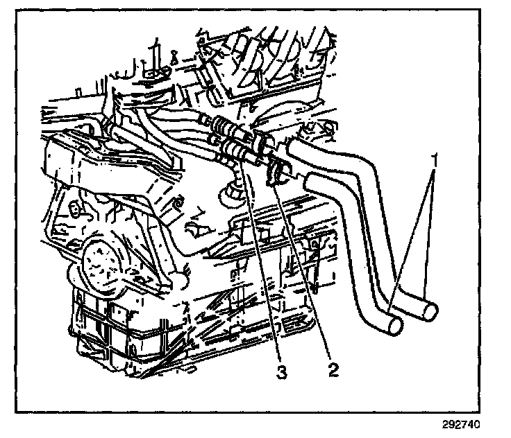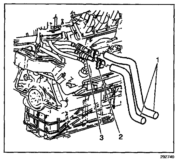 2. Squeeze the tabs on the quick-connect (3) in order to disconnect the heater hose (1) from the heater pipe.