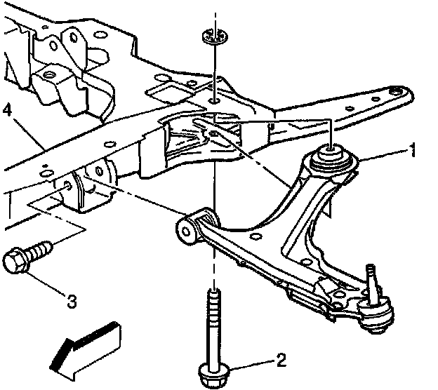 6. Remove the bolt (2) attaching the control arm (1) to the front suspension crossmember (4).