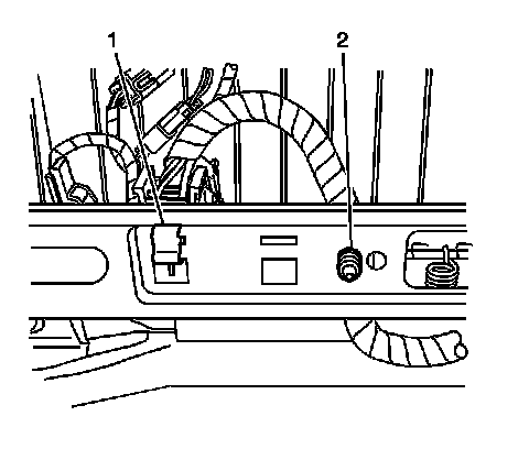 5. If equipped, install the push-in retainer (2) and tab (1) from the power lumbar harness to the motor bracket.