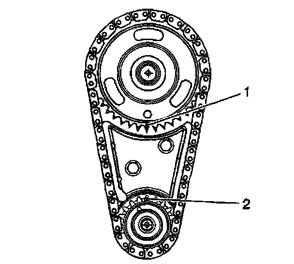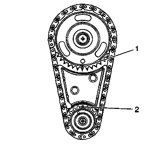 ^ The timing chain dampener to the crankshaft sprocket (2).