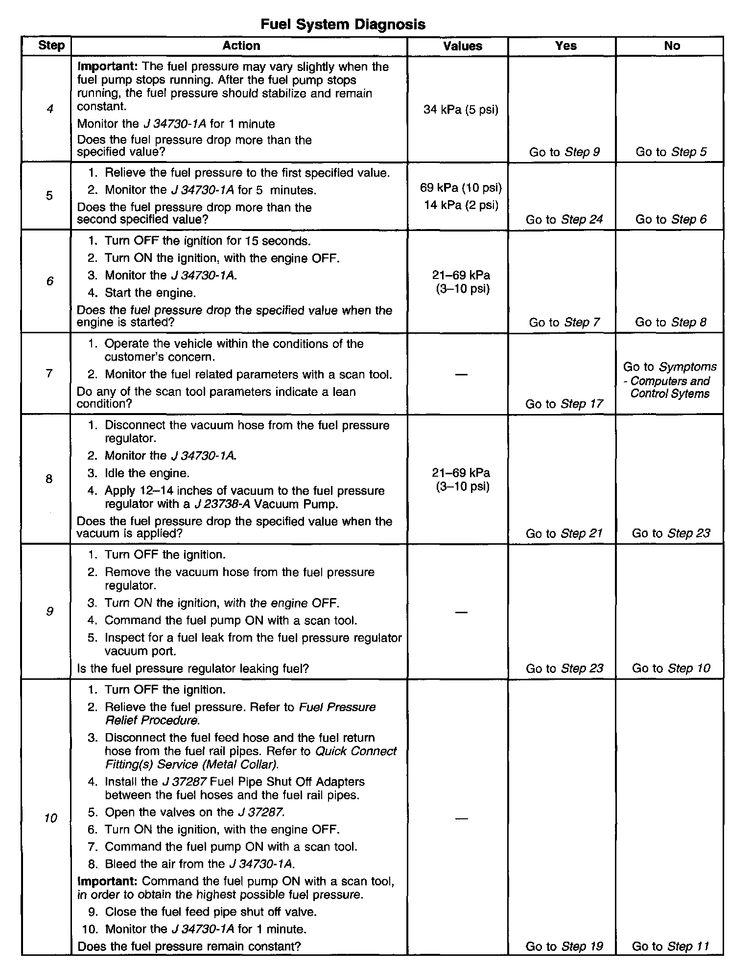 11. This step tests for a leaking fuel injector, or fuel pressure regulator. If the fuel pressure remains constant during this test, the fuel injectors are not leaking fuel.