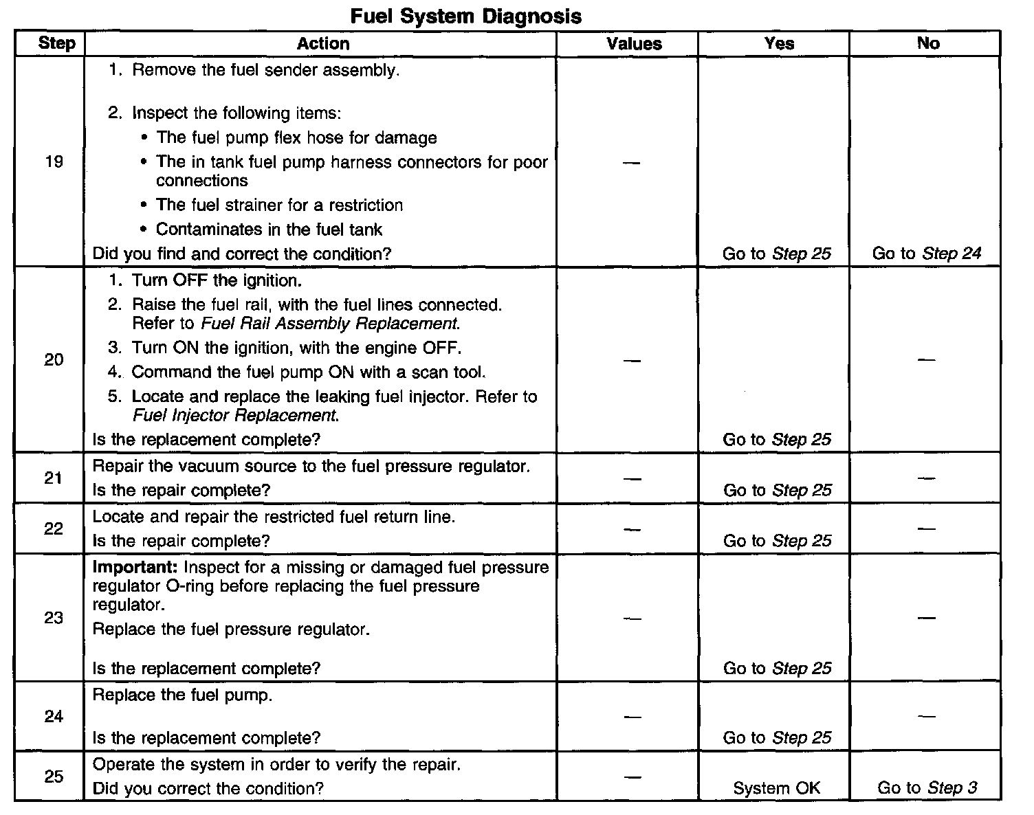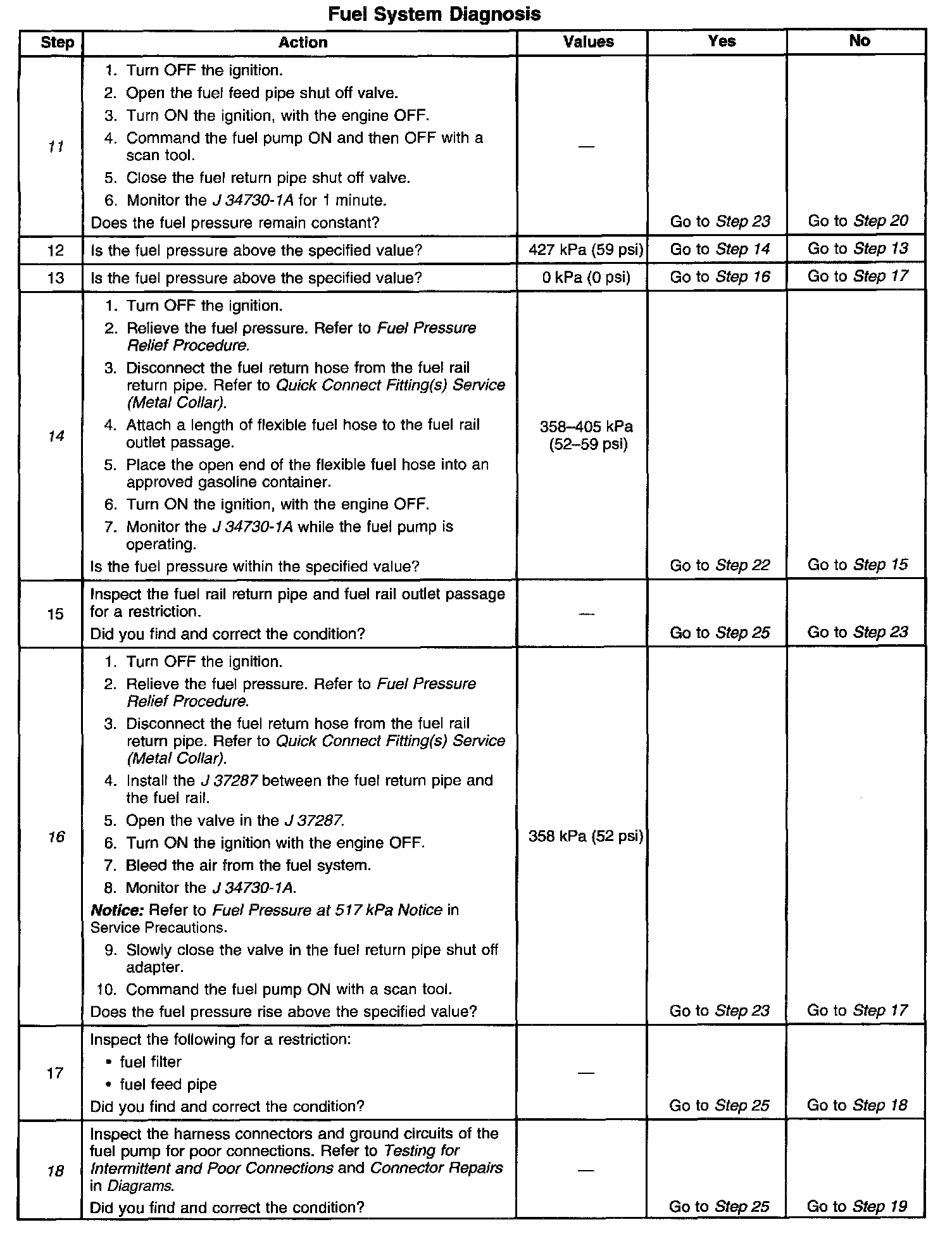 14. This step tests for a restricted fuel return pipe. If the fuel pressure is within the specified values, a restriction in the fuel return pipe is indicated.