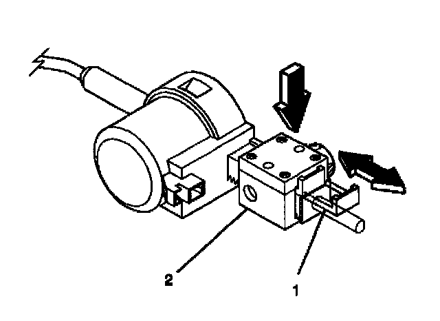 ^ Pull out the tab (1) on the adjuster block side (2) of the actuator.